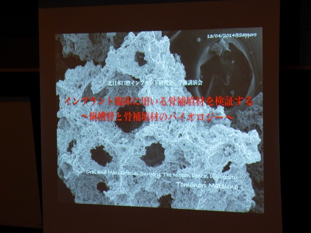 北日本口腔インプラント研究会主催 第1回 定例会 投稿日時: 2014年4月13日 投稿者: nao 今日は、北日本口腔インプラント研究会主催 第1回定例会 です。 講師は日本歯科大学生命歯学部 口腔外科学講座 松野智宣 先生です。内容は、《インプラント臨床に用いる骨補填材料を検証する~歯槽骨と骨補填材のバイオロジー~》。 インプラント治療は、歯槽骨に人工のチタン製のインプラントを埋入する必要があります。その、埋入する骨の幅や質が重要となります。その骨をコントロール必要があります。その、一つの方法に人工骨を使用する場合があります。その人工骨の勉強です。