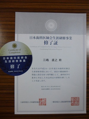 日本歯科医師会生涯研修事業 修了書 投稿日時: 2014年7月25日 投稿者: nao 今日、日本歯科医師会から「日本歯科医師会生涯研修事業 修了書」が届きました。 平成24・25年度の日本歯科医師会認定講習会を一定数受講する事により授与される物と思います。 ま、沢山勉強したご褒美といったところでしょうか?!(笑)
