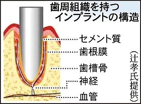 虫歯などで失われた歯根に代えて顎の骨に埋め込む金属の器具「インプラント」に、歯周組織のもとになる細胞を加えて神経機能を回復させるマウスでの実験に、理化学研究所多細胞システム形成研究センターなどのグループが成功した。人にも応用可能で、食べ物の硬さや柔らかさを感じる自然な「かみ心地」が戻り、食事の満足度向上が期待できるという。英科学誌サイエンティフィックリポーツ電子版に掲載された。
