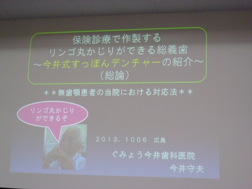 6日 広島で行われた講習会《保険診療で作製するリンゴ丸かじりができる総義歯~今井式すっぽんデンチャー~》を受講してきました。