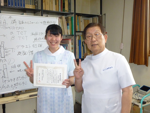 長谷川 美菜さん 終了式 投稿日時: 2014年5月9日 投稿者: nao みしま歯科医院に1ヶ月間研修に来ていた西野学園の長谷川 美菜さんが研修を終了したので終了式を行いました。 研修期間中は、一生懸命頑張ってくれました。来年には歯科衛生士の国家試験が控えていますが、絶対に合格してくれることと思います。 研修お疲れ様でした! 最後に理事長と記念写真です。